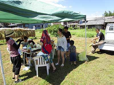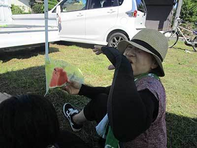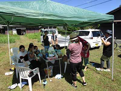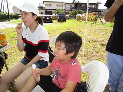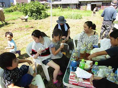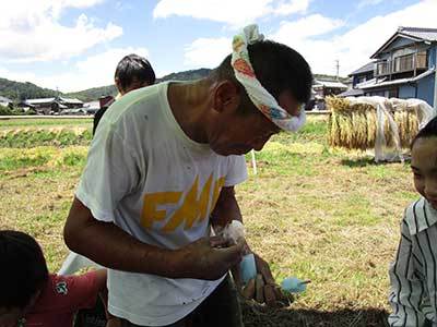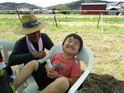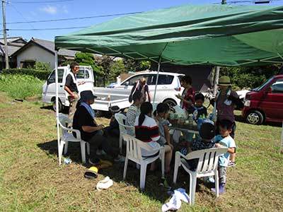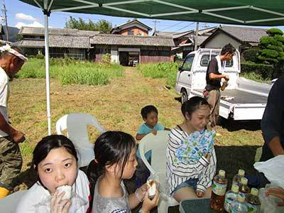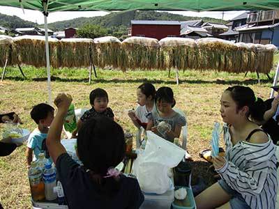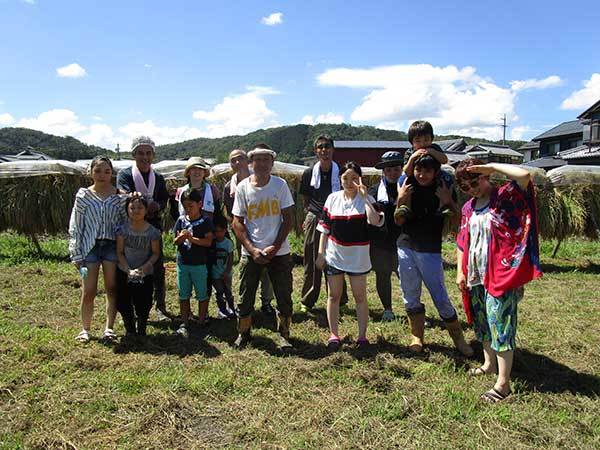 八幡1193-3 台風の心配も無く暑い一日ですが、沢山の人が稲かりを手伝いに来てくれ楽しく