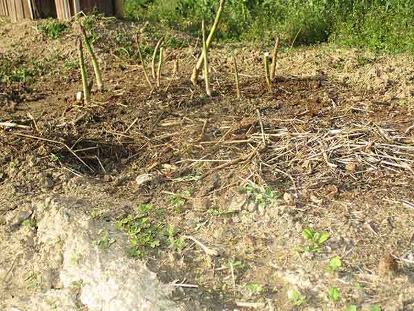 アスパラ もうじき少しですが収穫できそうです。草を削り 高度化成14-14-14 油粕 を撒き水をやる。