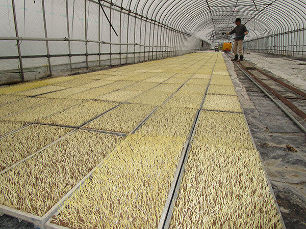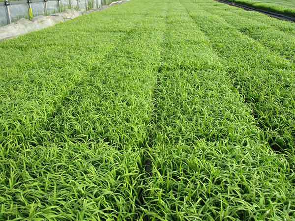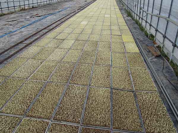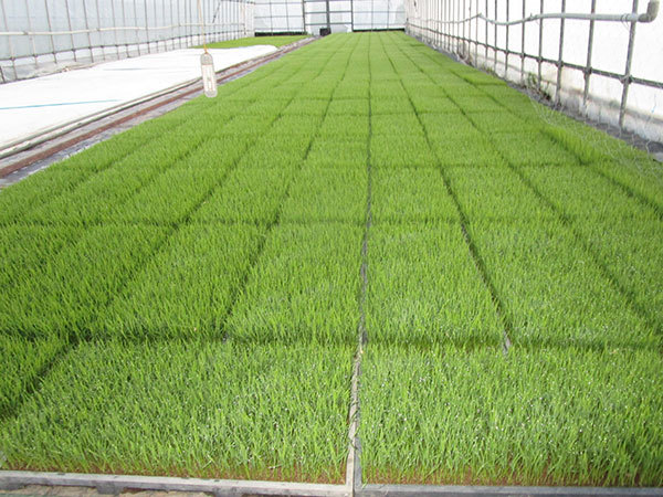 ハウスに苗箱を並べるて五日がたち綺麗な芝生の用です