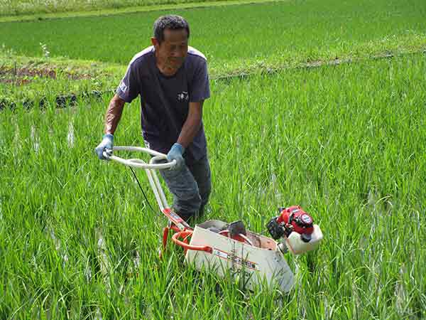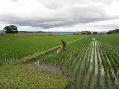 中干しをする為の準備で田んぼの溝を切り排水しやすい用にする。