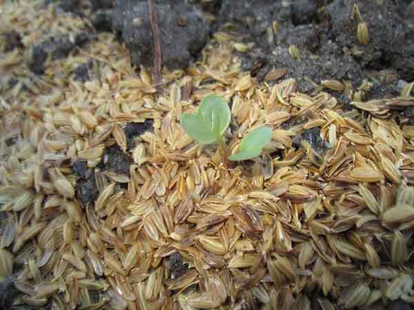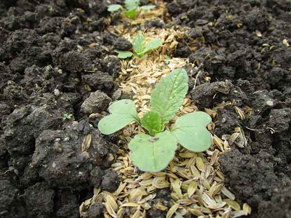 ラディッシュの二枚葉の苗が少しずつ出てきたよ。ラディッシュの二枚葉の苗
