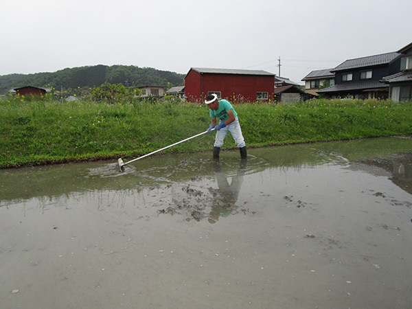 元肥【有機アグレット844】10a40kg~80kgを撒く。八幡1193-3 6Kg 八幡1193-1 15,2Kgを蒔き、トンボを使って手で代掻きをする