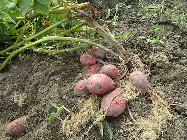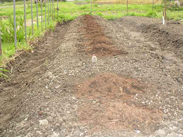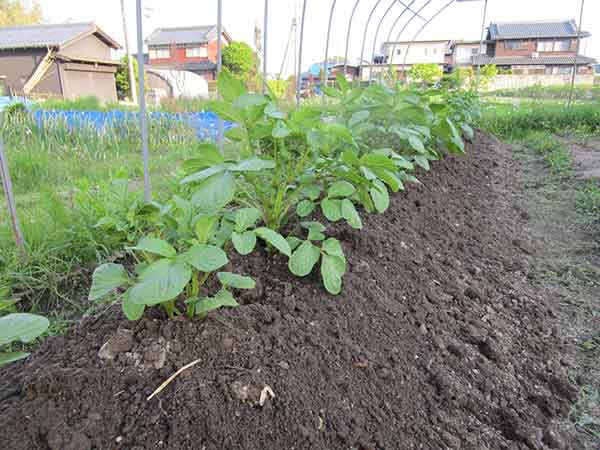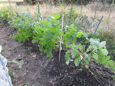 デストロイヤ-茎の重みで全部倒れてしまいでも 芋の方は思って居るほど良くない為、 肥料を遣り支えをして土掛けをする。