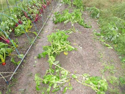台風去りビ-ツとデストロイヤ-は倒れてしまったが、ビ-ツの方は収穫出来そうです。ビ-ツは何株かは雨で土が流され収穫できそうな数株を収穫し後は肥料を遣り土を掛け不織布を捲る